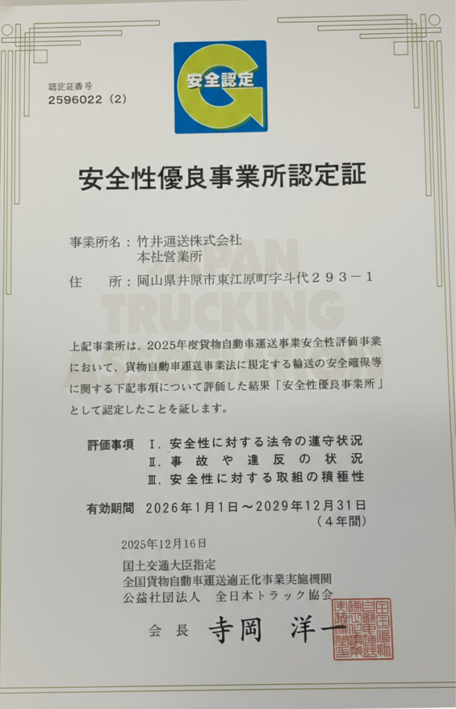竹井運送では前回に続き、3回目のGマーク(安全性優良事業所)を取得いたしました。